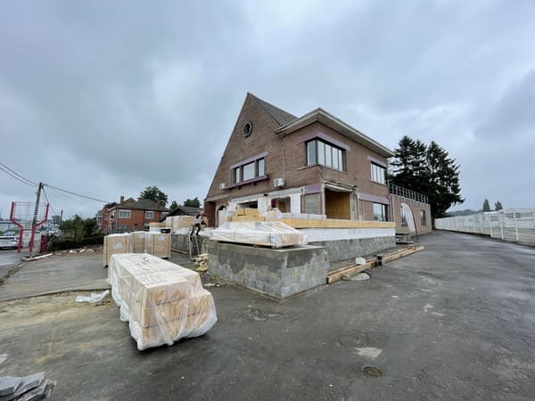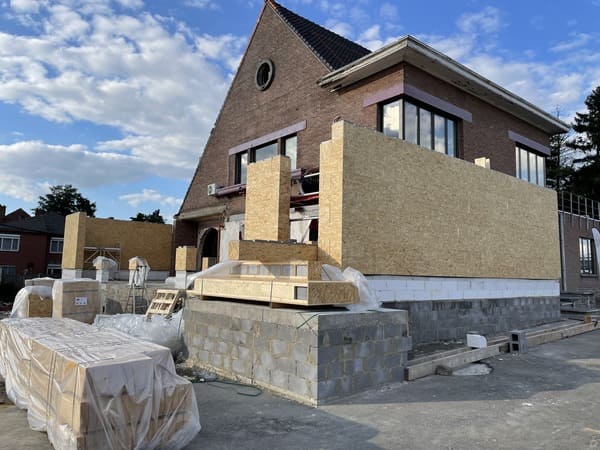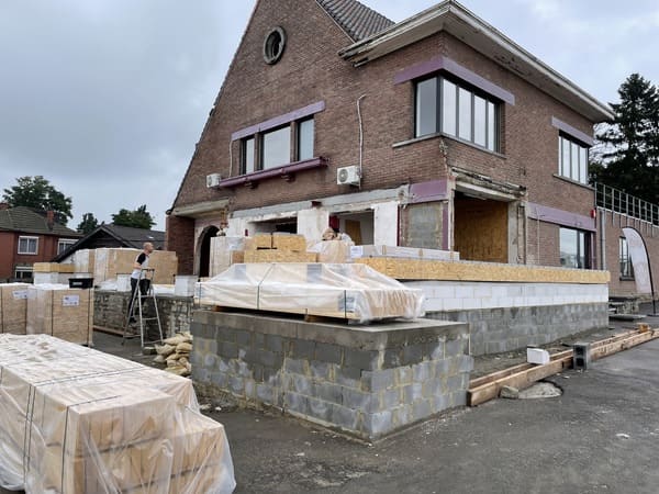 Construction d’une annexe à toiture plate avec de grandes baies vitrées.