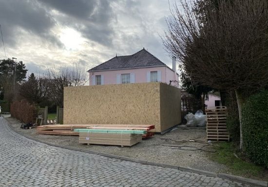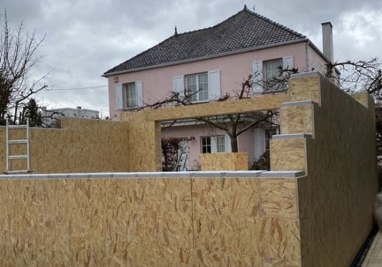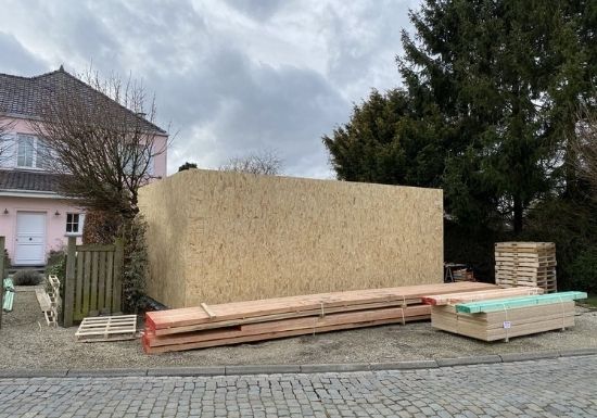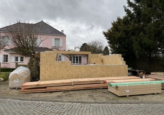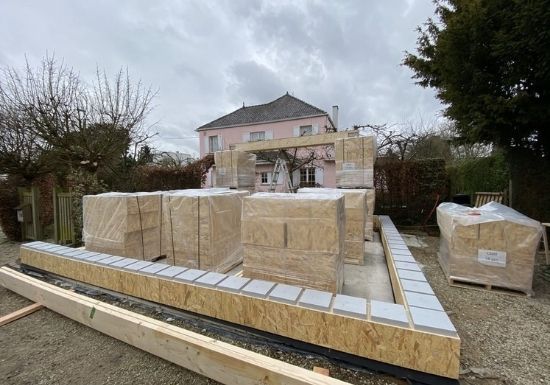 Nous avons ensuite fourni, sur chantier, le nombre de blocs de bois exact nécessaires à la construction du garage en ossature bois. Une livraison sur des palettes cautionnées et un nombre de blocs réfléchi pour permettre le zéro déchet sur place.
